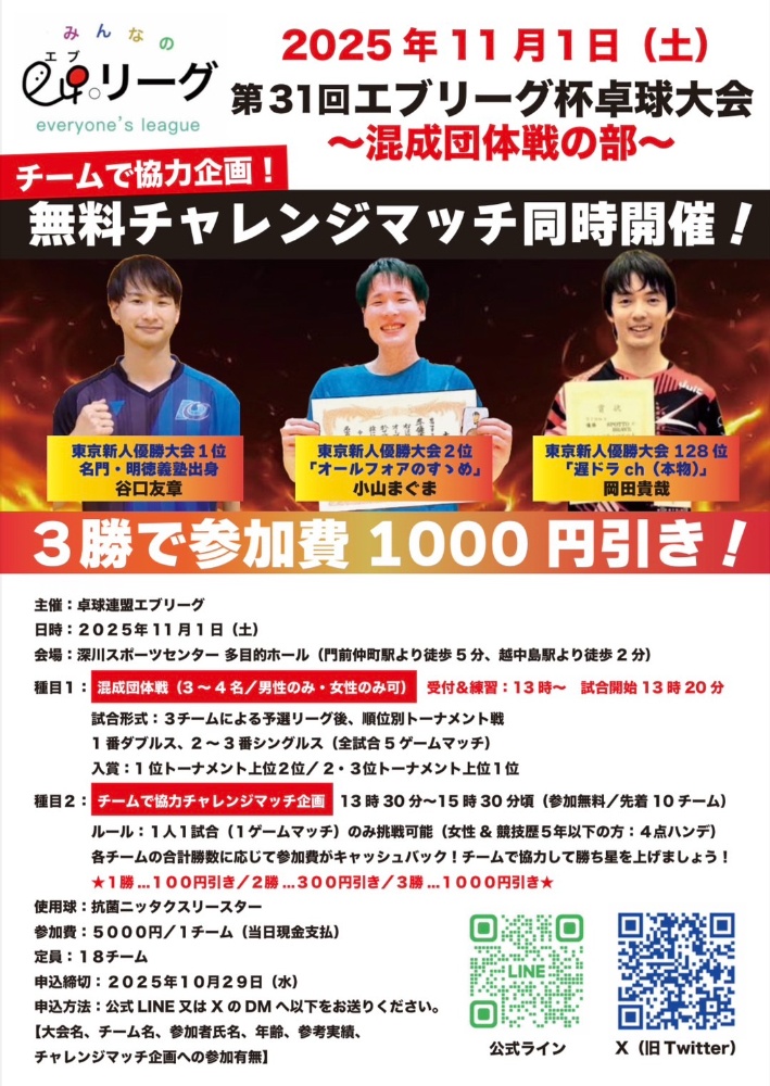 ~混成団体戦の部~日 程:2025年11月1日(土)時 間:13:00~会 場:深川スポーツセンター料 金:5,000円/チーム〆 切:2025年10月29日(水)状 態:受付中公 開:有
