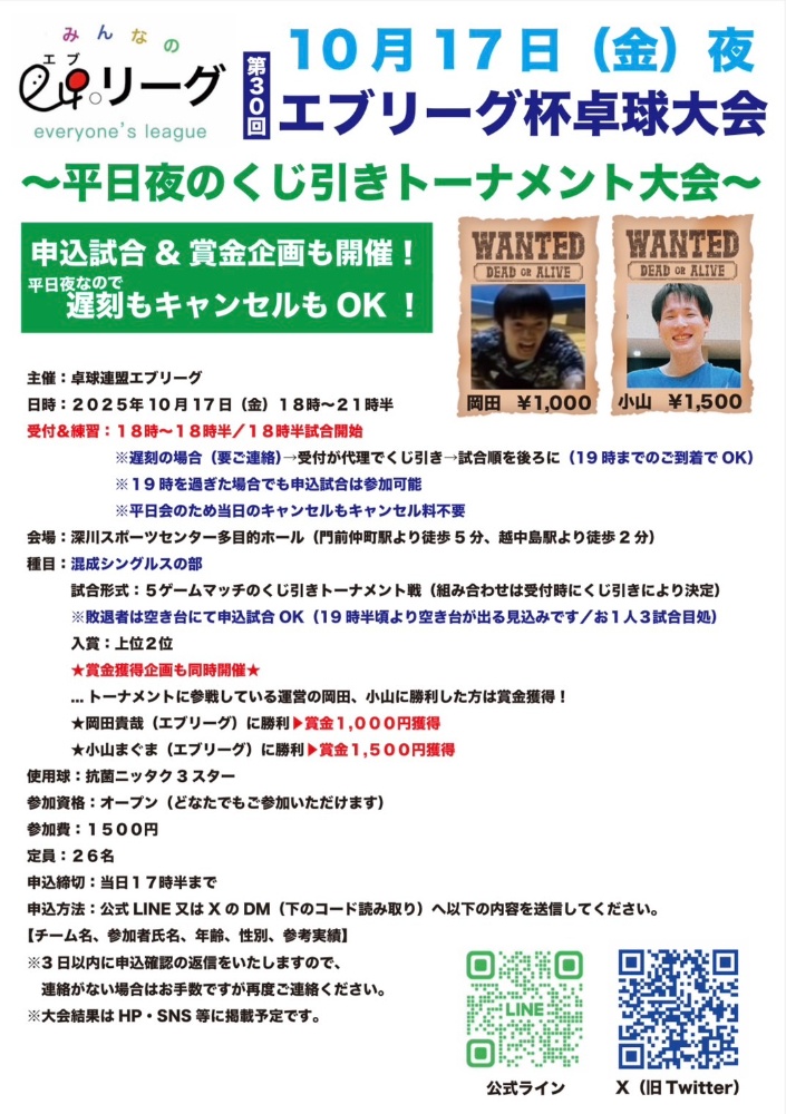 ~平日夜のくじ引きトーナメント大会~日 程:2025年10月17日(金)時 間:18:00~会 場:深川スポーツセンター料 金:1,500円/人〆 切:当日17時まで状 態:受付中公 開:有
