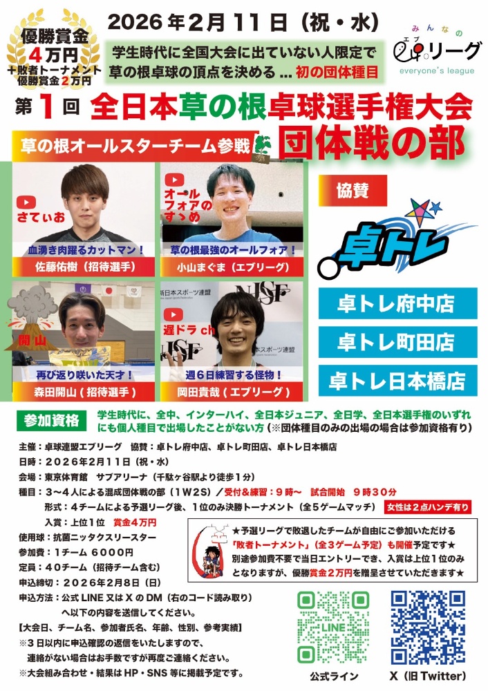 日 程:2026年2月11日(祝・水)時 間:9:00~会 場:東京体育館サブアリーナ料 金:6,000円/人〆 切:2月8日(日)状 態:受付中公 開:有