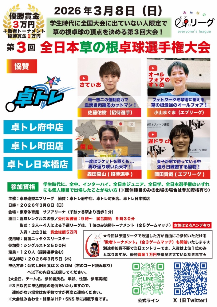 日 程:2026年3月8日(日)時 間:9:00~会 場:東京体育館サブアリーナ料 金:2,500円/人〆 切:3月5日(木)状 態:受付中公 開:有